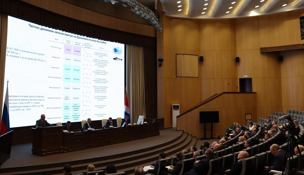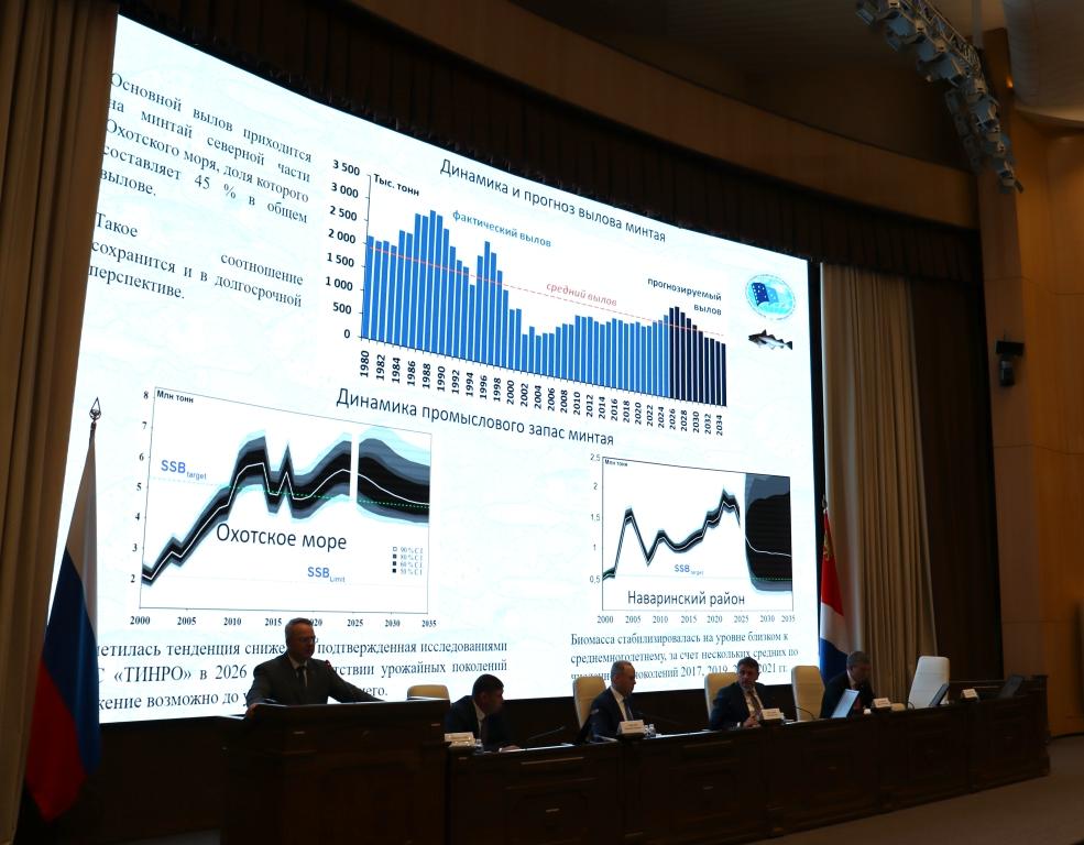 Были представлены сценарии прогнозирования возможного вылова водных биоресурсов на Дальневосточном рыбохозяйственном бассейне до 2035 года (минтая, сельди, трески). Например, вылов минтая в Беринговом море в 2027-2030 гг. возможен на уровне 580-500 тыс. т, а в следующие 5 лет – на уровне 480-450 тыс. тонн. В Охотском море современное состояние запасов минтая позволяет поддерживать его вылов на уровне около 1 млн тонн в 2027 г., а затем последовательно снижать к 2030 г. до 780 тыс. т, к 2035 г. – до 630 тыс. т.